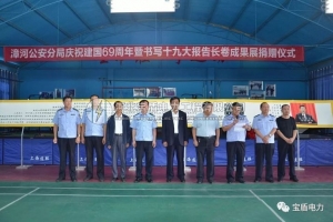 2018年9月29日,為慶祝新中國(guó)成立69周年,進(jìn)一步弘揚(yáng)無(wú)私奉獻(xiàn)、奮發(fā)向上的公安精神,“慶祝建國(guó)69周年暨書(shū)寫(xiě)《十九大報(bào)告》長(zhǎng)卷群成果展饋贈(zèng)儀式”在邯鄲市漳河公安分局隆重舉行。漳河經(jīng)濟(jì)開(kāi)發(fā)區(qū)管委會(huì)副主任董英、河北寶盾電力工程有限公司董事長(zhǎng)陽(yáng)洋、中國(guó)書(shū)畫(huà)古鄴分院院長(zhǎng)李德新、邯鄲市公安局文聯(lián)主席郝成年、公安文聯(lián)顧問(wèn)、市公安局原紀(jì)委副書(shū)記周振峰、公安文聯(lián)秘書(shū)長(zhǎng)趙祥吉、河北警察網(wǎng)總編任錫良、漳河公安分局黨委書(shū)記、局長(zhǎng)侯憲平、政委賈延平等領(lǐng)導(dǎo)一同參加饋贈(zèng)儀式。儀式由分局黨委副書(shū)記、政委賈延平主持。..